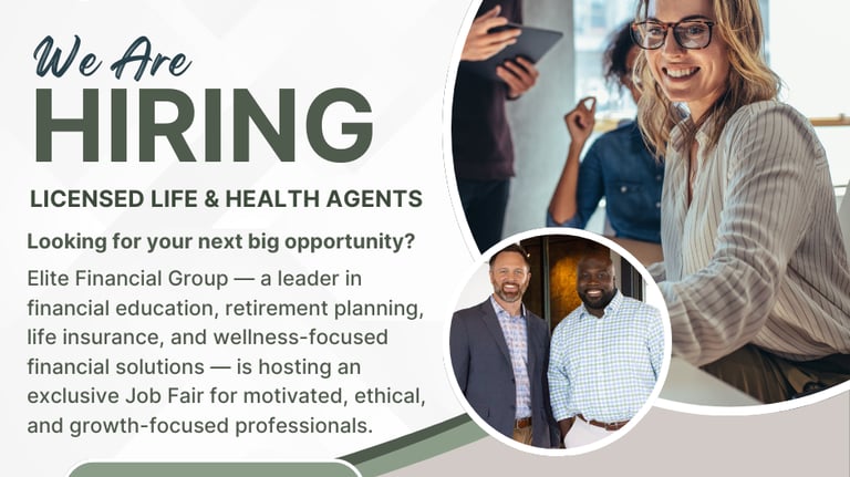Elite Financial Group, a leader in Financial Education, Retirement Planning, Life Insurance Solutions, and comprehensive client support is hosting a Job Fair for driven, ethical, and motivated professionals ready to accelerate their success.